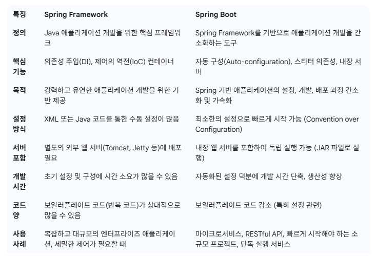 - Spring Boot는 Spring Framework를 더욱 "쉽고 빠르게" 사용할 수 있도록 돕는 도구입니다. 복잡한 설정을 자동화하고, 내장 서버를 통해 배포를 간소화하며, "스타터"를 통해 필요한 라이브러리 의존성을 쉽게 관리하게 해줍니다. 개발자가 "어떻게 설정할 것인가"보다 "무엇을 만들 것인가"에 집중할 수 있게 해 생산성을 극대화합니다.